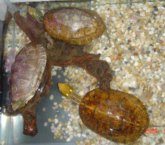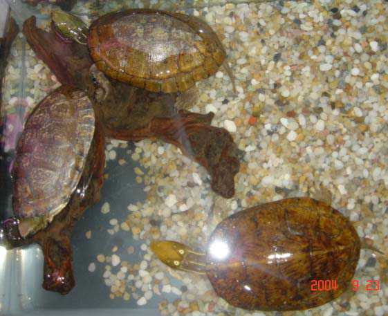 3.日常管理 四眼斑龟是变温动物,其活动、进食的多少随环境温度的变化而变化。所以,日常饲养中对气温、水温的记录非常重要。通过对温度的观察,及时掌握龟的活动、进食情况,尤其注意龟的进食量,如有些龟一般能食25克肉,但突然仅食很少食物,并持续2~3天,这是不正常的现象。另发现水中有蛋清状物或血红色团状粪便,这是龟患肠胃病的症兆。有些龟虽粪便不正常,但仍能进食,不易引起注意,这就需要仔细观察,及早发现病情,为治疗提供充裕的时间,否则到晚期也无能为力。 |