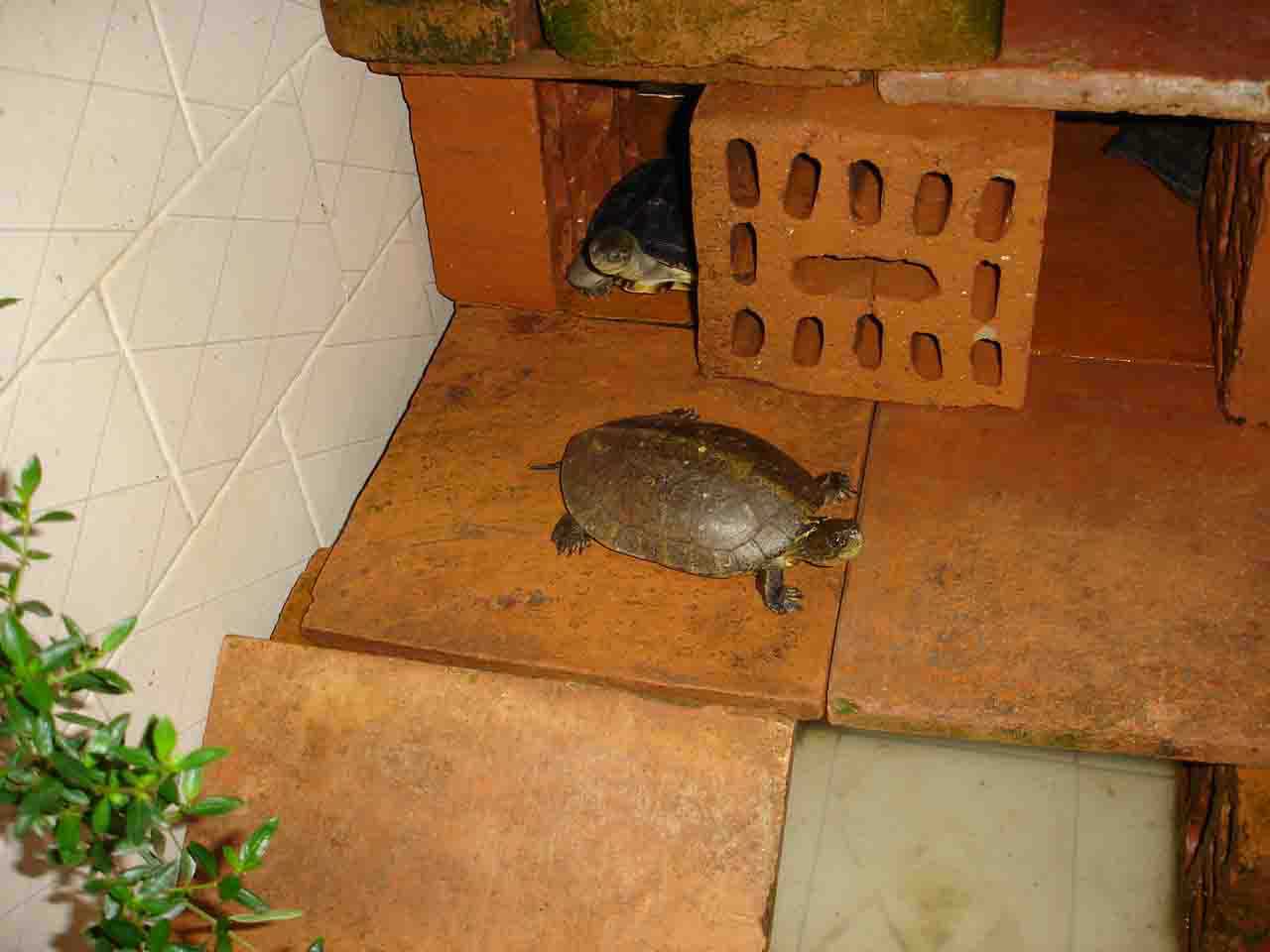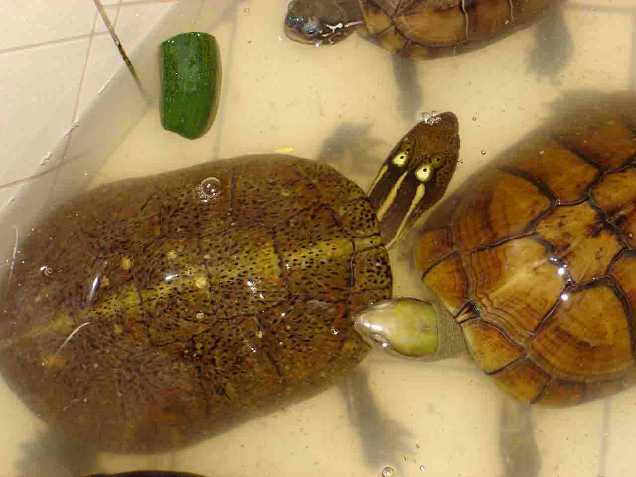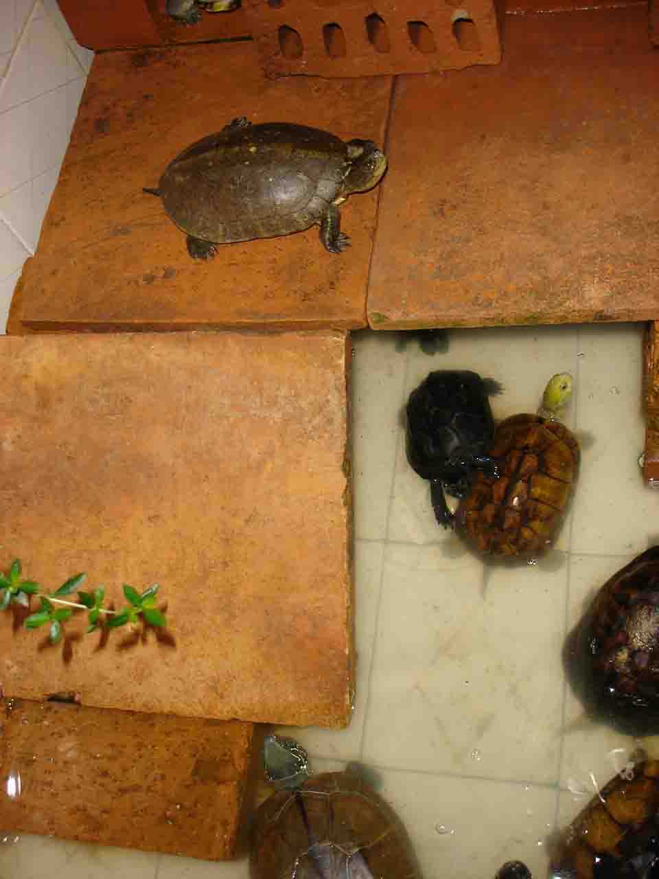 2.水质管理 四眼斑龟是水栖龟类。水质的好坏直接影响到龟的健康。在日常饲养中应做到二勤:勤换水、勤捞残杂。初春,由于龟进食量不稳定,投喂的饵料常有剩余,在投喂3小时后,将残饵及时捞出。每周换水1次,一般在喂食后2~3天进行,注入,新鲜水的水温应与原水温相差不大,一般不超过5~6°C为宜,否则,龟易患肠胃等病症;夏季,喂食后3~5小时换水;秋季,宜在中午换水,以免早晚温度低,影响龟的健康;冬季,龟停食,每月换水1次。无论在何季节,每次换水均需消毒,消毒的药物应经常更换,以免形成耐药性。