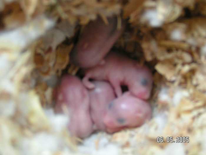 生产完的母鼠通常都会待在窝内不太会出来。窝内的小鼠眼睛也还没睁开、毛也还没长出来,大约只有两公克的重量。刚出生的鼠宝宝全身红通通,眼睛未张开,也尚未长毛,并会发出细细的吱吱叫声。你可能很想去瞧瞧他们在干啥,但还是不要去打扰也千万不要去触摸小鼠,因为此时的母鼠因为生产的关系会变得很神经质。如果小鼠的身上有人类的味道,或是母鼠觉得小鼠和窝被发现的话,很可能会把小鼠给吃掉、咬死,或是放弃育儿。这种情形最常在生产后一周内发生,但也不代表一周后就没有关系,所以母鼠生产之后到小鼠断奶期间,都不可以去碰触小鼠为妥,就连打扫也要避免。