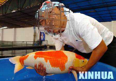 来自日本的技术员土田义夫自豪地展示泳姿彩锦鲤养殖场一尾83公分长的锦鲤(6月19日摄)。这尾市值超过40万元人民币的锦鲤是该养殖场的鱼王。做为广东南海区大沥街道扶植的一个绿色产业,该养殖场的年产值达上千万元人民币。做为“中国铝材第一镇”南海区大沥街道,近年来更注重发展具有高附加值的绿色产业,当地政府出台一系列优惠政策鼓励经营者做“环保商人”。那小鬼子长相十分讨厌