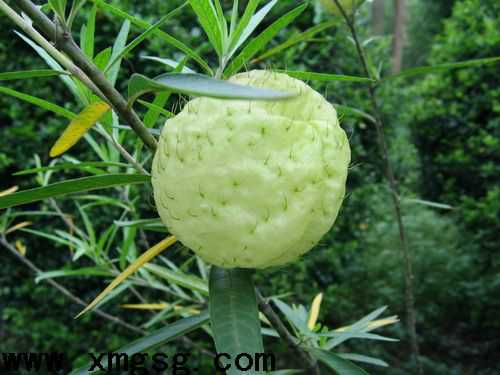 学名:Gomphocarpus fruticosus 别名:钉头果 气球唐棉 科属:萝摩科钉头果属 分布:原产于非洲,华北及云南有栽培。 形态特征:萝摩科钉头果属灌木植物。具乳汁。叶对生或轮生,条形,长6-10厘米,宽5-8毫米。聚伞花序生于枝的项端叶腋间,长4-6厘米,有花3-7朵;花红色,兜状。骨突果肿胀,圆形或卵圆形,长5-6厘米,直径约3厘米;外果皮有软刺,刺长1厘米。种子卵形,顶端具白绢质种毛。 习性:喜高温多湿和阳光充足环境,不耐寒,稍耐阴和干旱,要求肥沃、疏松和微酸性的沙壤土,冬季温度不低于10℃。